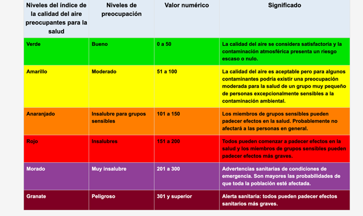 La EPA creó el ICA y se utiliza para comunicar información sobre la contaminación y la salud. El ICA incluye seis categorías con códigos de colores, cada una correspondiente a un rango de valores del índice. Cuanto mayor sea el valor del ICA, mayor será el nivel de contaminación del aire y mayores serán los riesgos para la salud.